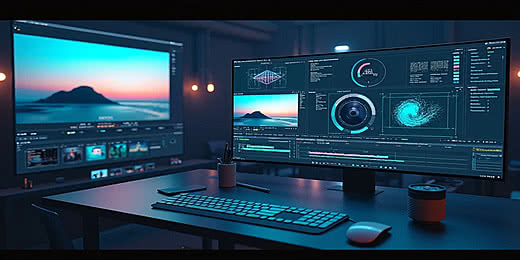 نستخدم برامج احترافية رائدة في الصناعة مثل Adobe Premiere Pro, DaVinci Resolve, و Adobe After Effects للمؤثرات البصرية.